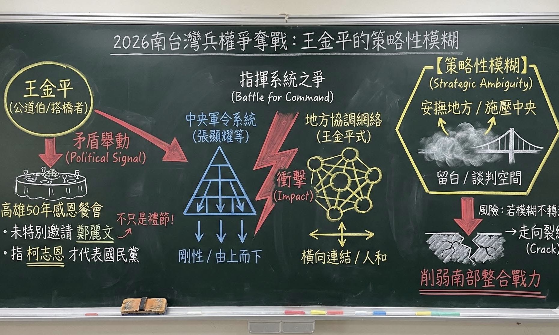 照片為作者提供 【聚論壇杜聖聰專欄】王金平多年來被稱作「公道伯」,靠的不是口號,而是在人際、派系與制度縫隙裡,把衝突磨成可協調的形狀;他也曾以口述著作《橋:走近王金平》把自己定位成「搭橋的人」。 正因如此,外界才會覺得更矛盾:一個被期待最懂「和氣生財」的政治人物,卻在高雄的從政50年感恩餐會上,公開表示「沒有特別邀請」國民黨主席鄭麗文,甚至說「柯志恩才代表國民黨」。 這份「不邀請」的重點,並非只關乎禮節,更牽動南台灣兵符的歸屬。 近來有報導指出,鄭麗文為強化2026南部選戰布局,擬重用張顯耀,甚至傳出以副主席督導南部選情、另建南部智庫等安排,引發地方層級不同聲音。 如果南台灣的選戰指揮被導向一套「黨中央軍令系統」,而不是尊重既有地方人脈與王金平式的協調網絡,對習慣以「橋」來處理政治的人而言,難免不是滋味;也難怪餐會的「缺席」會被讀成一種訊號,而不只是行程安排。 策略性模糊的概念強調,領導者刻意保留語意空間,讓不同受眾各自讀到可接受的版本,以維持表面一致、延後正面衝突、並換取談判與調整的時間。在高度競爭的政黨政治裡,模糊不是怯懦,而是一種 管理多元與權力分配的工具:它不把門關死,也不把話說滿,卻能讓對手與盟友同時感受到壓力與退路。 王金平那句「沒有特別邀請」,正是典型的策略性模糊:他沒有說「拒絕」或「刻意排除」,於是仍保留日後補救的空間;但他又讓「主席沒來」成為公共議題,使訊號完成投放。 更關鍵的是,「柯志恩才代表國民黨」。這句話把「代表權」從職務階層改寫成「戰場責任」,把話語主權從黨中央移回高雄地方盤:誰能承擔勝負、誰能完成整合,誰就先被承認為「代表」。 同一套模糊語法,也同時對兩邊發出不同訊號。 對地方而言,這是安撫:高雄的盤仍以地方關係與在地組織為核心,黨中央不應以空降指揮取代既有網絡;對黨中央而言,這是施壓:若要談整合,就必須拿出尊重地方、並能承擔協調成本的方案,而不是只靠任命來「接管」。 策略性模糊的厲害之處,就在於一句話同時容納「你我仍可合作」與「我不會無條件讓渡」兩種意涵。 然而,模糊能買到時間,也會累積代價。 如果國民黨主席鄭麗文確實以張顯耀為南部戰略樞紐,地方反彈或疑慮就可能擴大;而王金平的公開留白,可能會讓外界把「權力路由」的爭奪放大成「黨內不合」。畢竟,在2026南台灣這種艱困戰區,團結都未必贏,不團結幾乎必輸;模糊若未在關鍵時刻轉為清晰的分工,便可能從「留白」滑向「裂縫」。 因此,王金平餐會最值得被看見的,不是誰坐在哪一桌,而是「橋」的方向正在被重畫。王金平用策略性模糊守住自己的角色:他仍是橋,但橋不必然通往黨中央指定的路線;他仍講協調,但協調不等於把兵權交出去。 對國民黨而言,真正的考題不在於補不補邀請,而在於能否把「黨中央的軍令效率」與「地方派系的動員現實」接成同一條路;否則,再多的橋,也可能因為各走各的而成為斷橋。 作者為銘傳大學廣電系主任 ● 專欄文章,不代表J-Media 聚傳媒立場。