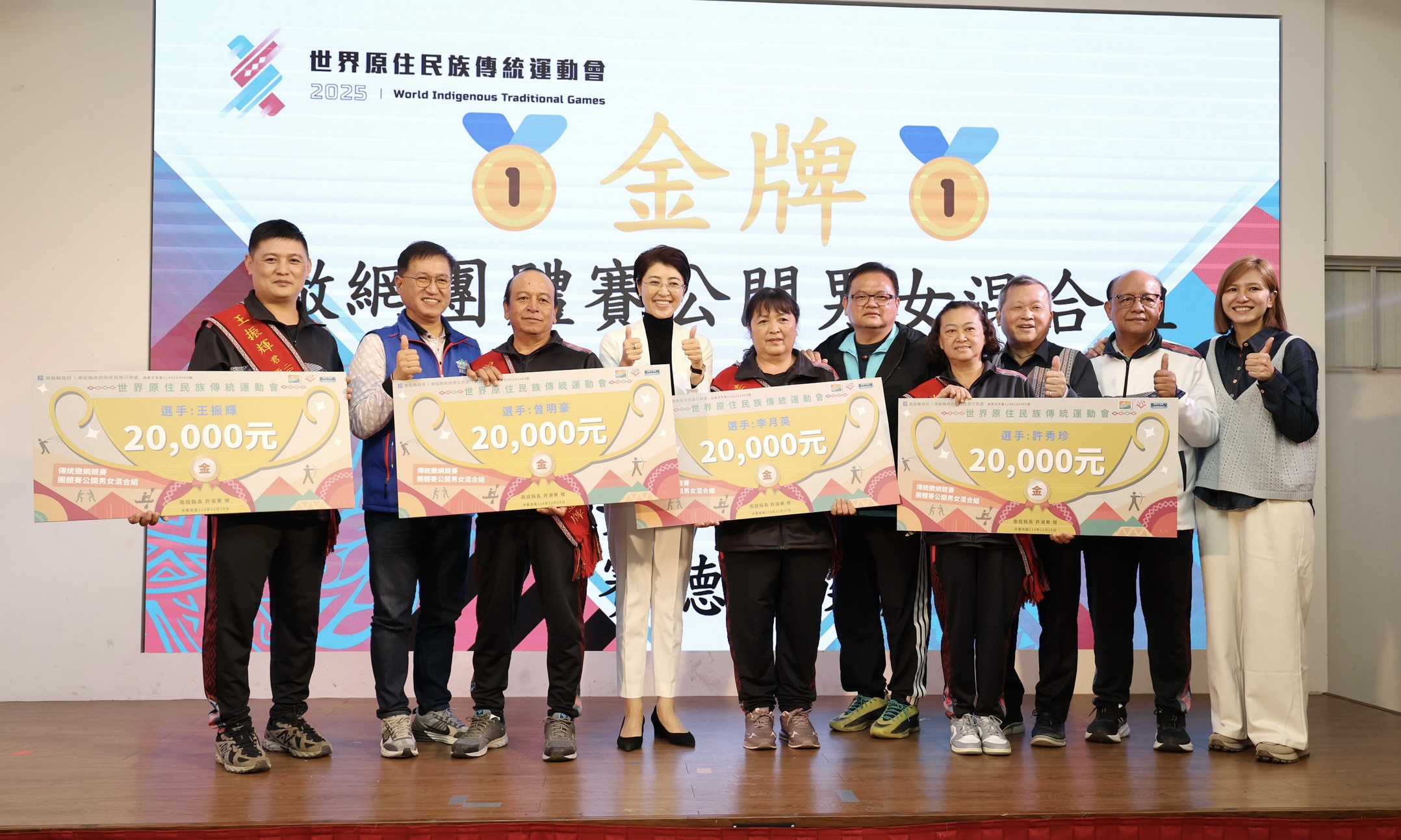 照片取自南投縣政府 【聚傳媒特約記者陳欣如報導】首屆「2025 世界原住民族傳統運動大會」日前在臺灣圓滿落幕。南投縣代表隊此次表現極為亮眼,於10國強敵環伺下,勇奪2金、2銀、3銅,榮獲總排行榜第二名之殊榮。南投縣長許淑華28日特在南投市心園婚宴會館舉行慶功宴及頒獎儀式,表揚獲獎選手並頒發獎助金;仁愛鄉公所、信義鄉公所及魚池鄉公所也加碼獎金,以示嘉勉。 許淑華縣長表示,選手們不僅在運動競技上展現卓越體能,更成功地將南投原住民族的勇氣與文化之美推向國際舞台,期許每位選手都能成為「文化使者」,繼續將南投原民的驕傲帶往更廣闊的舞台,讓世界看見南投原住民族兼具傳統智慧與現代活力的完美身影。 許淑華縣長指出,此次運動大會是臺灣首次主辦的國際級原民盛會,涵蓋10個國家、28支隊伍及約1100名選手參賽。為了讓南投縣代表隊能發揮實力,無後顧之憂的在競技場上爭取佳績,除了原民會補助經費約90萬元,不足經費由縣府補助。此次南投縣派出「賽德克族」、「邵族」與「布農族」三支代表隊,面對來自美國、加拿大、紐西蘭、日本等國的強勁對手,選手們肩負族人期待,以堅定信念與體力極限搏鬥,展現了「原鄉承諾、文化守護」的高尚精神。慶功宴不僅是慰勉選手傑出表現,縣府也特別頒發個人獎金,鼓勵更多優秀人才,傳承原住民族文化,發揚傳統技藝及運動,為族人爭光,為南投縣爭光。