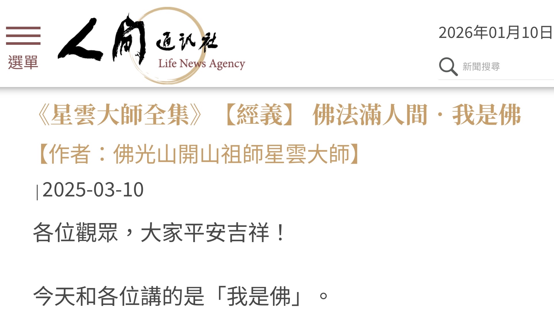 圖片為佛光山人間通訊社截圖 【鄭功明投稿】 壹、迷霧散盡時,我終於看見: 宇宙, 只是覺性中的一場投影。 人間, 是我們最深沉、最久遠的一場夢。 地獄受苦雖長,人間入戲更深。 朋友, 我想把你一直忽略、 卻其實深藏在心底的真相告訴你: 你所謂的「現實」, 從來不是一個獨立存在的世界, 而是本來清楚的覺性之中, 一場被誤認為真實的夢境。 佛法中稱之為「本覺」、「法身」,或名「原始佛」。 它非創造宇宙的神,也非虛構的傳說;而是一切世界、時間與「我」顯現之前,本自清明、常寂、無生無滅的覺性。 宇宙並非某個時刻「被造出來」,而是在這覺性中,由一念微細的誤認而顯現。 《楞嚴經》說: 「覺非所明,因明立所。」 覺性本來圓滿, 卻因一念「想要看見」, 原本不分內外的一體覺知, 暫時分化為「能見的我」與「所見的境」。 就在這一念之間, 世界出現了。 這不是創造, 而是投影。 原本你是整張銀幕, 卻在那一刻, 把自己誤認成了銀幕中的角色。 於是, 心識如同一部高速運轉的投影機, 將內在的覺知狀態, 不斷顯現在名為「宇宙」的畫面之中。 所謂外在的十法界 從地獄到佛法界, 並非自外而來的世界, 而是每一個人自己的覺性, 在不同迷悟程度下, 所顯現出的層層境界。 你必須明白, 這一切其實是 「自己變現給自己看」。 所有的眾生與你, 本是同一個圓滿佛性; 只因一念無明, 才在夢中分出了 你、我、他。 這裡所說的「夢」, 指的正是此刻 這個正在讀這段文字、 正在思考、 正感覺「活著」的你。 就像你昨晚在夢中, 也曾真切地感覺到冷熱、悲歡; 但在醒來那一秒, 夢裡的你與萬物, 瞬間了不可得。 當下的現實, 本質也是如此。 在這場宏大的夢境裡, 我們執著於自己變出的幻象; 因緣牽引, 交織成因果與業力。 然而, 當你回歸本來的佛性, 徹底從這場 「人間大夢」中醒來, 你會驚覺 原本, 無一物。 沒有受苦的眾生, 也沒有獨立存在的你我。 一切的紛擾、輪迴與掙扎, 都只是 同一個覺性在遊戲, 同一個本原在投影。 我們, 從來都是同一個。 內在感應, 形成性格、思維與心境(正報); 外在感應, 投影成所經驗的環境與際遇(依報)。 世界如夢, 卻非亂夢; 夢境雖幻, 因果不空。 眾生正因看不見這一點, 才在夢中生起三種深層迷惑: 一、空間的無窮。 空間並非容器, 而是心念向外延展的認知邊界。 心中具足何種狀態, 眼前便顯現何種世界。 二、實體的堅固。 物質之所以看似穩固, 只是心識自動補幀, 將剎那生滅誤認為連續不變。 當對「我」的抓取稍歇, 便能照見 內外、主客、你與世界, 只是覺知中的分別假相, 如冰融海, 界線自然消失。 三、夢境層層疊。 一念接著一念, 執著又生執著, 投影因此層層加密。 許多所謂的「覺醒」, 往往只是從較粗的夢中醒來, 卻又落入另一層更細微的夢境。 若不能回光返照, 看見這一切本是覺性之中 自編、自導、自演的一場戲, 眾生便只是在不同層次的夢裡 不斷輪轉。 而我們, 已經演得太久了 久到忘了自己, 本來就是那張 承載萬象、 卻從未生滅的銀幕。 心靈三層夢境 四土境界 人生,為何如此牢不可破? 佛陀早已說得清楚: 我們其實在三種不同層次的夢裡輪迴。 這三個夢境,正對應佛法所說的「四土境界」, 形成一幅宇宙級、心靈級的生命地圖。 接下來,我要讓你看到 這張地圖如何在你的生命中運作。 🥉 第三層夢(執著的粗夢) 煩惱:見思惑 境界:凡聖同居土(內外十法界交織處) 這是最粗重、生死流轉的夢, 也是眾生最感真實、最難醒來的一層。 在此,內在「六凡法界」與外在環境長時共振,使你 把身體當成「真正的我」, 把成敗當成實有。 無論是天界的耽溺, 或人間的焦慮, 皆只是幻相的不同樣貌。 一切苦樂之所以如此逼真, 是因為你被執著牢牢綁住。 這些執取,正是夢境運轉的電力: 熏習越深,夢境越實, 外在法界的束縛感也就越難擺脫。 【心靈動態實景:見惑的爆破感】 見惑, 如支撐夢境世界的鋼鐵支架。 當「見身為我、見境為實」時, 內在心行隨頻率高低, 感召天界之奢或三途之苦, 於六道中自然成熟; 而當修行真正破除見惑, 那不是漸次鬆動, 而是整個支架在心底瞬間崩塌的巨大震盪。 你於此刻深刻體悟: 天堂的輝煌與地獄的陰森, 皆是心性投射的依報顯影。 正因看清這場內外互感的幻夢, 覺醒的裂縫, 才真正被打開。 🥈 第二層夢(分別的細夢) 煩惱:塵沙惑 境界:方便有餘土 當粗重執著鬆動, 夢變得輕、柔、微細。 你會以為自己醒了, 但其實 你只是從劇情夢醒來, 掉入更細膩的心所迷宮。 分別、比較、衡量、 計算功德、在意他人看法 這些,全都是塵沙惑。 【心靈動態實景:塵沙惑的消融感】 塵沙惑, 像心靈的透明玻璃牆。 你不再執著牆內事物, 卻仍執著「牆的存在」。 你用這道牆,區分: 「我有修,你沒修」 「這是佛法,那是外道」 當真正進入空性, 玻璃牆同時、無聲地消融。 不是激烈破碎, 而是溫暖且徹底的「消散」。 你看到無量法門、無數眾生, 在同一片光明中,毫無界限。 但仍是夢。仍是迷。 🥇 第一層夢(習氣的微夢) 煩惼:無明習氣 境界:實報莊嚴土 這是最深、最古老、最難觸及的夢。 即使禪定深厚、 念佛熟練、智慧已開, 仍會有一絲 「不該存在的陰影」浮現。 那,就是無明習氣。 它不是痛,不是煩惱, 更像透明的影子, 沉在看不見的心底。 只