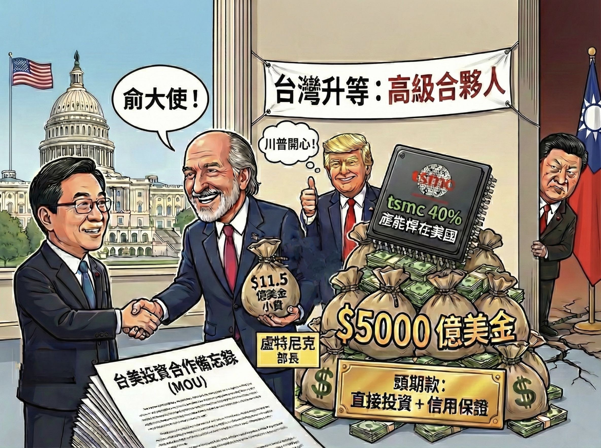 圖片為作者提供 【聚論壇李宗衡專欄】外交部長林佳龍在近日的專訪中提到:「雖然中共會抗議,但抗議不就是證明了大家身體很誠實嘛」。這句話點破了這場外交突破的底牌。一月十五日,在華盛頓商務部大樓,我國代表俞大㵢與美方簽署了「台美貿易與投資合作備忘錄」。商務部長盧特尼克在現場數度喊出「俞大使」。這反應證實了一個現實:當台灣捧著五千億美金讓美國總統「開心」時,「名分」就是結算後的副產品。 回顧過往,我們在軍購市場的地位更像是一個「拾荒者」。美軍清倉庫,我們清口袋,拿回來的多是過時武器。現在這聲大使喊得響亮,是因為我們遞上了一份標價五千億美金(約十六兆台幣)的「投名狀」。這筆錢不僅是為了買武器,更是為了把台灣從買舊貨的小弟,拉進了第一島鏈「準」同盟。 這份豪賭的結構拆解如下:其中二千五百億美金的「實體質押」,由台積電等核心企業承諾將最先進製程搬去美國,目標是將四成產能落地本土;先不必急著喊「掏空」,搬出去的是讓美國人安心的「抵押品」,換來的是兩國工業命脈的深度綑綁。 另一半二千五百億美金則是「政府信用保證」,由我國政府出面背書,確保供應鏈在美融資順暢。我們交了這筆錢,換來的是「15%的對等關稅」,這就是我們留在全球供應鏈核心圈的「保費」。 中華民國作為大金主,美方在2026財年預算中回饋的這十一點五億美金,在本質上就是一筆比例失衡的「小費」。其中十億美金指定要在三月前拉起「無人機蜂群」產線。這代表美軍直接把他們的戰略邏輯與指揮標準,移植到台灣的防衛體系中。 這種「高維度戰略」的整合,是為了讓台灣在第一島鏈的聯防中,具備即時、同步且自主的打擊能力,確保戰時能與盟友無縫接軌。剩下的一點五億美金,名義上叫「庫存回補」。美方撥出軍武倉庫裡的現貨給我們,再拿這筆預算去補齊他們自家的最新型缺口。 這標誌著台灣的防衛需求正式納入美軍預算循環。我們不再只是買舊貨的散戶,而是升等成為手握M1A2T頂配戰車、與準同盟國家預算連動的實質「高級合夥人」。這聲「大使」標示了一個位置的確認。五千億已經質押,十一億「小費」也已落袋。當台灣的防衛不再是自家的事,而是變成了「台灣有事就是日本有事」的聯合作戰架構時,這五千億買下的就是一張讓對手不敢輕舉妄動的門票。 這是一場沒有退路的豪賭。那聲「大使」像是一枚安靜的印記,標示著台灣已正式完成「準同盟」的入會資格。當第一島鏈的武裝力量都已就位面對中共,每一方都把「牙齒露出來」時,台海和平才有保障可能。 作者為資深媒體人、中國文化大學政治學系博士候選人。 ●專欄文章,不代表聚傳媒J-Media立場。聚傳媒、中時電子報同步授權