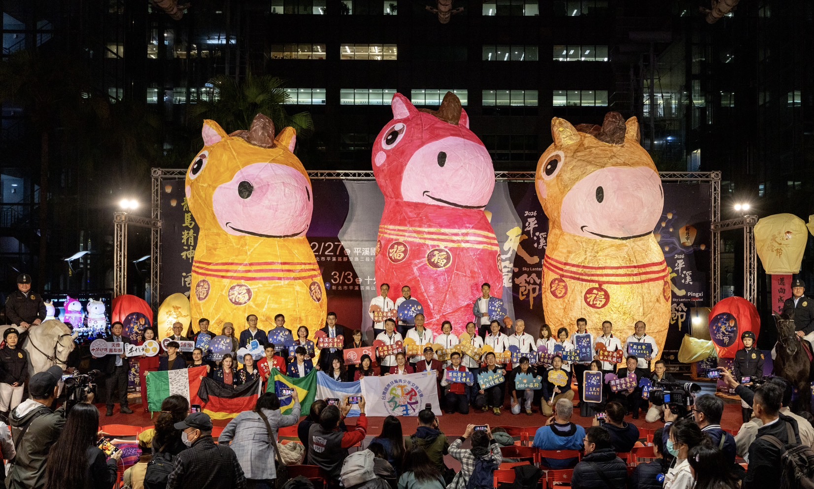 照片取自新北市政府 【聚傳媒特約記者陳欣如報導】2026新北市平溪天燈節舉行記者會,由新北市市長侯友宜與活動代言人「極地超馬運動員」陳彥博揭開序幕,並熱情邀請民眾於2/27(五)平溪國中「馬驫奔騰,邁向成功」、3/3(二)十分廣場「龍馬精神,活力新北」一同參與年度文化節慶,今年首次將3盞20呎造型馬年天燈,從平溪區移師至新北巿巿民廣場齊聚亮相,宣布活動開跑,並向大家拜早年祈福。 新北市長侯友宜表示,榮獲BETTER FUTURE 2025柏林設計金獎及BETTER FUTURE 2025雪梨設計金獎的新北巿平溪天燈節不僅是新北市的驕傲,更是全球矚目的文化盛典。今年活動以「馬驫奔騰,邁向成功」、「龍馬精神,活力新北」為主軸,融合馬年光雕秀,與5盞造型天燈主燈共同百盞齊飛,為民眾獻上夜晚最動人的視覺祈福饗宴及最震憾的祈福盛典。 本次記者會平溪場3盞20呎高馬年特色大型天燈主燈,首次至板橋都會區巿民廣場現身亮相,現場可以看到3盞20呎高的福馬天燈合體聚首曝光,其中金色福馬代表財富、紅色福馬代表福氣,橘色福馬代表大吉大利,三馬組合「驫」,寓意「馬驫奔騰,邁向成功」;氣勢磅礡及福氣十足的3盞巨型馬型天燈,搭配新北巿騎警隊的4匹駿馬象徵馬到成功,也為馬年祈福拜早年。值得一提的是,在3/3(二)十分場將有2盞20呎高的「龍馬」雙神獸主燈,代表「龍馬精神,活力新北」也將展出升空,也請大家拭目以待。 本次活動2/27(五)平溪場共計9波天燈施放,每波100盞天燈同時升空,3/3(二)十分場共計9波段,每波150盞天燈齊飛,免費的天燈施放券也將於活動當日上午10時30分於活動地點服務台準時發放,想親身體驗上百盞天燈齊放氛圍的民眾,可提前規劃前往時間共襄盛舉!即日起也開放網路預約天燈施放券,民眾可透活動官網事先預約獲得天燈施放券,還可獲贈神秘小禮物。