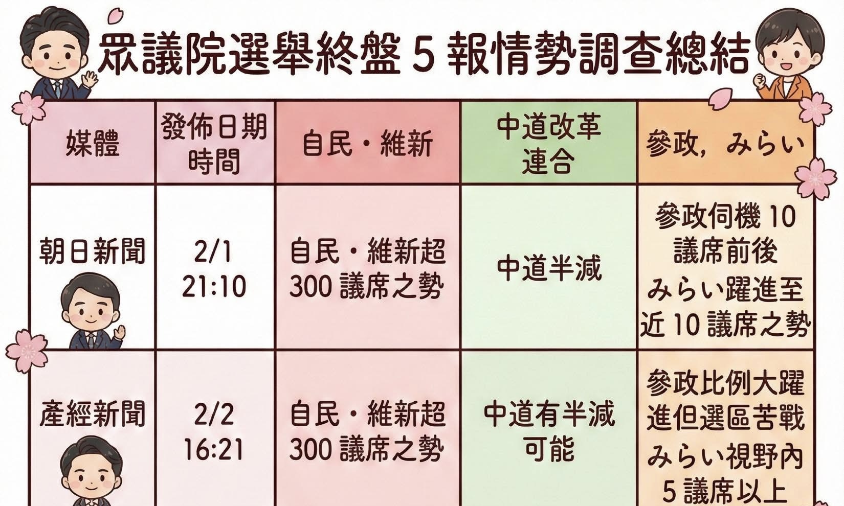 照片為作者提供 【聚論壇杜聖聰專欄】高市早苗押上首相位子的政治賭注 日本眾議院大選前,高市早苗主動宣示:如果自民黨與維新聯盟在這次選舉中拿不到下議院過半席次,她將負起政治責任、辭去首相職務。這不是事後檢討式的曖昧說法,而是把「是否延續政權」清楚綁在選民手上的一張選票。 原本外界多半預期,自民黨在連年醜聞與物價壓力下,頂多只是勉強守住多數,高市的宣示更像是「敗選下台」的預告。如今終盤民調卻顯示,自民與維新不僅不愁過半,反而朝向三百席以上、甚至逼近三分之二修憲門檻,原先設下的「紅線」幾乎不可能被觸發,反而強化了早市早苗敢賭、敢負責的領袖形象。 五大報終盤民調:保守集中、在野潰縮 從五大報整理出的選情來看,自民・維新聯盟合計有望跨越三百席,中道改革聯合被普遍預期將面臨「席次腰斬」甚至「大幅減少」,原本寄望於政黨輪替與權力均衡的想像暫時破滅。在野勢力不但無法形成可替代的執政聯盟,反而持續分裂成多個中小政黨,只能在區區數十席之間內耗。 這種結構性失衡,使得選民在「討厭自民」與「害怕失序」之間,只能再度選擇把權力集中交給能掌舵的保守聯盟。原本高市孤注一擲開出的「未達266席就下台」場景,如今幾乎成為一種政治宣示的加分,而不是失敗風險。 日本民意的轉向:從懲罰執政到務實保守 如果把時間拉長來看,這次選舉其實是對過去幾年「懲罰票」的修正。地方選舉與東京都選戰曾讓自民黨吃足苦頭,許多人相信中央政權遲早會被同樣的浪潮吞沒。但在俄烏戰爭、台海緊張、中朝軍事挑釁與全球通膨的壓力下,日本社會的情緒逐漸從「教訓自民」轉向「不要讓局勢更不穩」。 在野陣營對歷史、醜聞與貧富差距的批判沒有說服力地轉化為可行的安保與經濟路線,中間選民於是用腳投票,回到「雖不滿意,但還是要有人負責」的務實保守選擇。高市早苗選擇把辭職承諾說死,反而在這種焦慮氛圍裡強化了「願意為結果承擔」的印象。 修憲、防衛與對中關係的升溫風險 一旦自民與維新接近或掌握三分之二席次,日本在修憲與防衛政策上的推進空間將大幅擴張。兩黨長期主張明文化自衛隊地位、提高國防預算、加強與美國及區域盟友的聯合作戰能力,對中國的軍事壓力採取更為主動的姿態。這意味著,中日之間不再只是圍繞歷史問題與經貿摩擦,而是逐步走向「安全與軍事對峙」的結構。 對北京而言,日本將從「被動跟隨美國的同盟國」,轉變為在第一島鏈上更積極的戰略行為者,外交衝突頻率與軍事擦槍走火風險都將同步升高。對日本多數選民來說,這是面對周邊威脅時不願再完全依賴他國保護的直覺反應。日本民眾要的是「能保護自己」的國家,而不再讓歷史記憶單方面決定未來選擇。 台日將從情義相挺到風險共同體 台日民意之間的互信與好感,近年持續維持在極高水位,台灣長年把日本視為最重要、也最親近的民主夥伴之一,日本社會對台灣的情感支持也屢屢在民調中名列前茅。在這樣的基礎上,日本國內政治的「保守集中」與高市早苗的豪賭,其實直接關係到台灣的安全與戰略選擇。 高市早苗以「266席辭職」為賭注,卻在終盤民調中迎來近乎壓倒性的優勢,這提醒台灣:我們所面對的,已不是戰後和平憲法下那個被動、內向的日本,而是一個試圖在風險時代重新拿回主導權的鄰國。 民調來源為日本學者小笠原欣幸臉書。 作者為銘傳大學廣電系主任 ● 專欄文章,不代表J-Media 聚傳媒立場。
