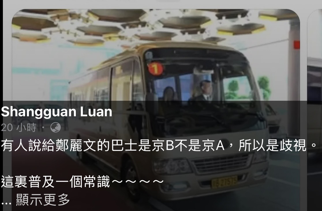 照片為作家臉書截圖 【聚傳媒特約記者陳冠宇報導】近日網路流傳一則以「鄭習會」為題的相關報導,並搭配國民黨訪問團搭乘中型巴士的畫面,進一步渲染為「遭中共刻意矮化」。經查,這類說法存在多重失真,不僅對北京車牌制度的理解錯誤,連所謂「鄭習會」本身的相關敘事,也已被指出屬於錯假新聞,不宜未經查證即轉傳或引用。 《聚傳媒》查核指出,葉慶元律師貼一張照片狠打臉:不要瞎掰鄭麗文搭巴士被矮化好嗎?事實上,中共高層如習近平過往亦曾搭乘類似車款,因此不能僅憑車型就推論為「矮化」。然而,若進一步比對網路流傳版本與已知查證資訊,可發現爭議焦點其實不只在車型,而是外界將車上懸掛的「京B」車牌,也錯誤解讀為羞辱或降格的象徵。 事實上,「京B」並非貶抑標記,而是北京營運車輛的正常牌照類型。依公開車牌說明資料,京A與京B屬於不同用途的牌照,其中京A多指北京市登記的非營運車輛,京B則為營運車輛使用,包括出租車與客車等。換言之,接待訪團所使用的租賃中巴、商務中型客車,若懸掛京B車牌,正是符合其營運性質的常見配置,並非遭到刻意羞辱。 此外,網路上也常將「京A」以訛傳訛為所謂「權貴專用車牌」。實際上,京A是北京較早期發放的非營運車牌號段,因歷史背景與現存數量較少,才逐漸被附會出特殊政治想像;這種印象並不等於凡非京A即代表規格較低,更不能反向推導出京B就是「矮化」證據。 知名陸配作家上官亂也在臉書發文澄清相關誤解。她指出,外界將京B車牌與政治羞辱直接畫上等號,屬於對中國車牌制度缺乏基本理解後的過度延伸。尤其兩岸議題高度敏感,但越是敏感,越不能依賴片段畫面、二手訊息與既有偏見來拼貼解釋。否則就會把日常行政或交通安排誤判為政治訊號,最終不但無助於理解真相,反而讓錯誤認知持續擴散。因此相關評論必須建立在對大陸的政府制度與社會運作有基本理解的前提上,才有意義可言。 綜合而言,這波「巴士矮化」說法之所以具有誤導性,在於它把正常的營運車牌包裝成政治符號,再將未充分查證的「鄭習會」敘事繼續擴散。對閱聽眾而言,面對此類涉及兩岸政治敏感性的影像與說法,仍應先確認事件真實性,再檢視制度背景,避免落入以圖帶風向、以訛傳訛的資訊陷阱。