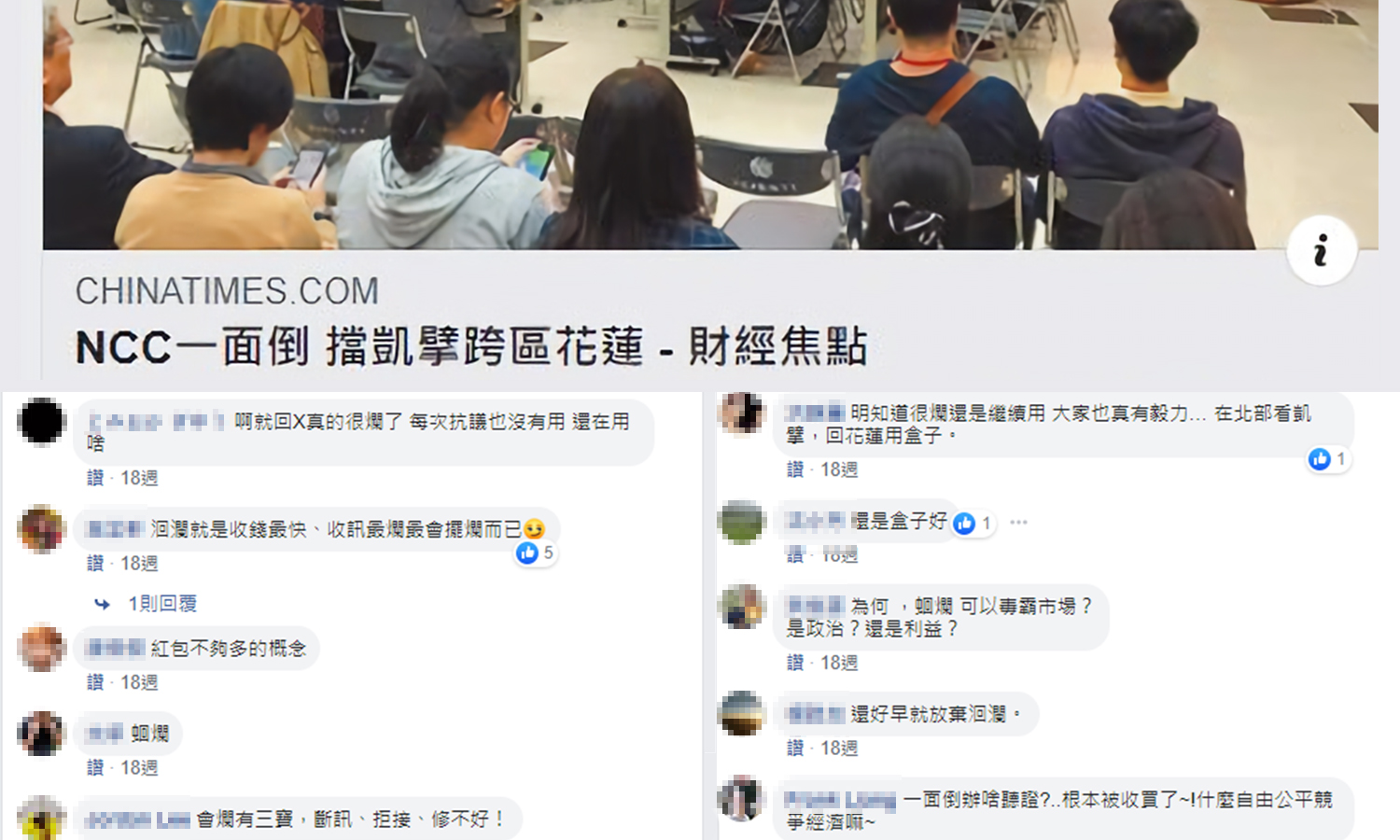 林姓網友2019年10月底在「花蓮同鄉會」臉書社團分享「NCC一面倒 擋凱擘跨區花蓮」的新聞,結果有18次分享,底下留言也非常激烈,意見幾乎一面倒,許多人批評花蓮的有線電視根本就是壟斷,而且品質不佳、客服電話常常打不通;還有網友不只批評當地的既有業者,甚至連帶質疑主管機關,還有網友批評業者是不是後台很硬?不然為什麼會引發護航的嫌疑?許多留言的民眾都認為應該要開放競爭,否則他們寧可不看現有的有線電視。儘管有不少民眾抱怨,但是資料顯示,洄瀾有線電視的每股盈餘是其他獨占地區有線電視業者的2-13倍,顯示獲利驚人。