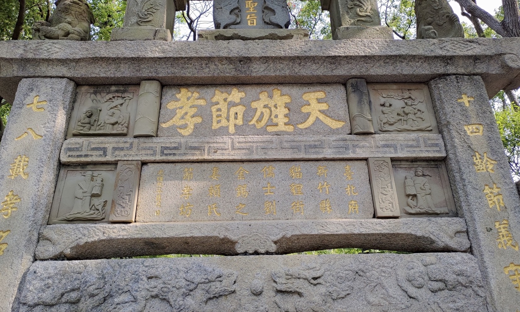 還記得台北二二八公園裡的「黃氏節孝坊」嗎?右邊石柱也刻著「二八痛撫⋯⋯」黃氏從28歲守貞活到74歲。