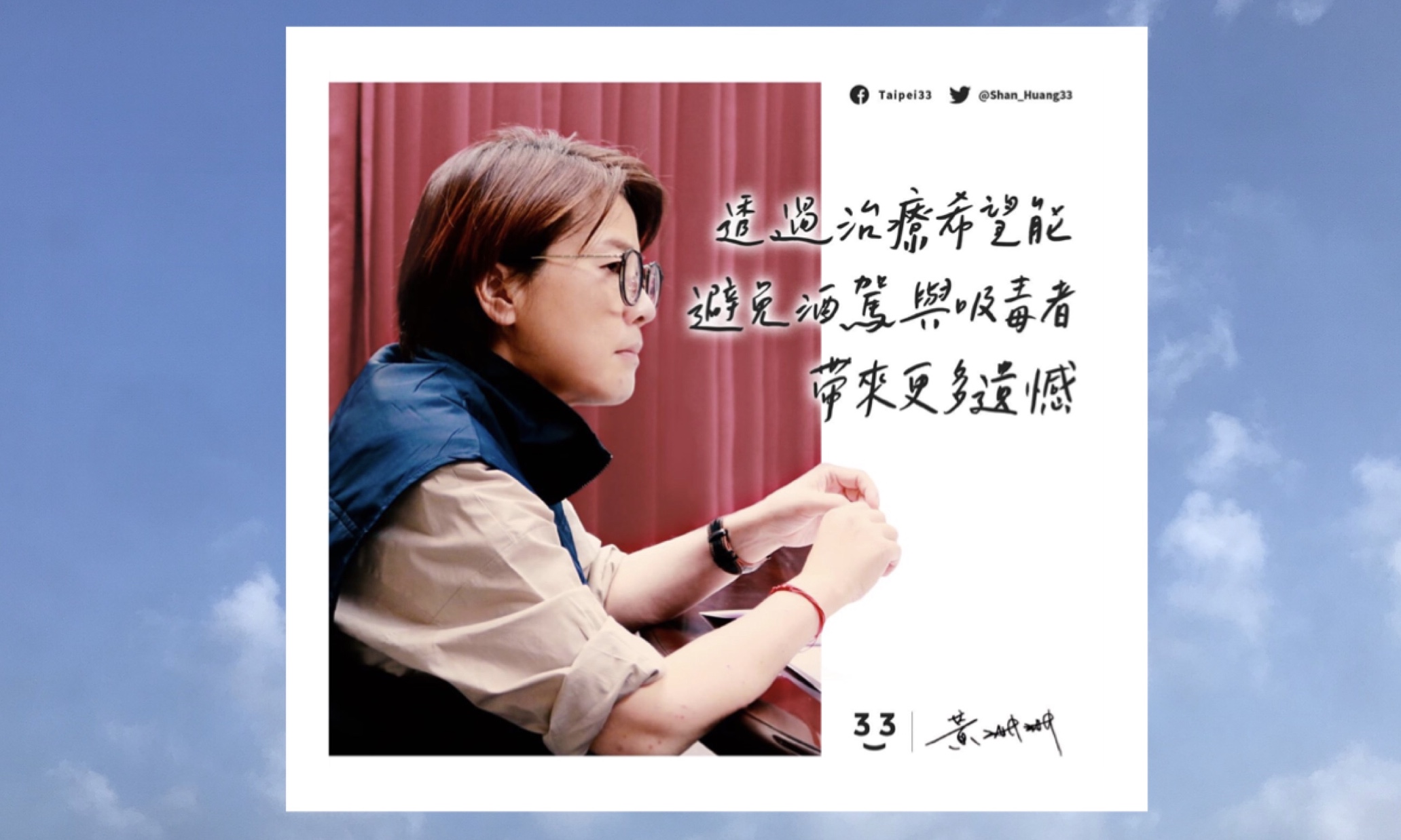 因此,市長希望我能主持北市府對酒駕和毒品相關的專案,將自己的理念貢獻給北市。上個月,北市府和地檢署合作,向地方法院推廣「酒駕醫療介入方案 」,希望法官在判決時,將「治療」列入考量。根據統計,酒精成癮在初犯者中約占1/3,再犯者約占2/3。