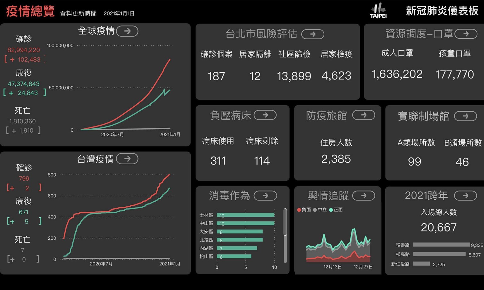 【愛傳媒黃珊珊專欄】新年快樂!這是我每天看的疫情儀表板,12月31日加了跨年晚會的版本。我們每天都戰戰兢兢,台北市人口密集又有捷運等公共運輸,沒有一天是輕鬆的。