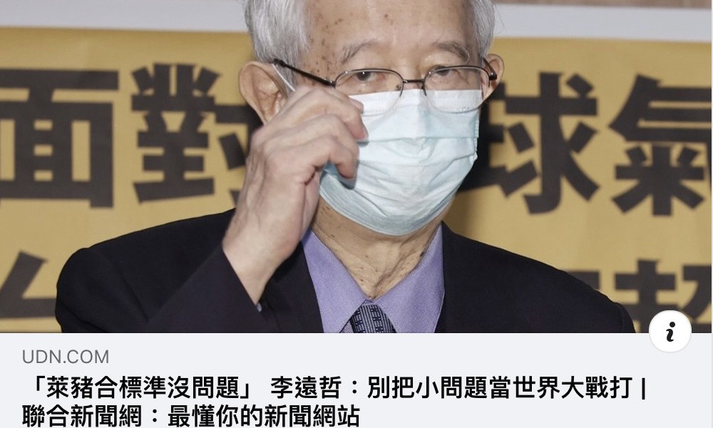 【愛傳媒葉毓蘭專欄】看到李遠哲說萊豬和核食在某個限度下應該沒有問題,「不能把很小的問題當成世界大戰在打」。