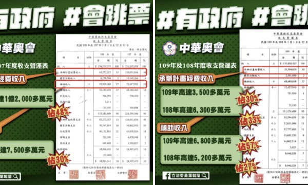 政府每年花大筆預算挹注中華奧會,依中華奧會的財報(承辦計畫+補助),其收入109年有87%是靠來自政府收入,108年政府收入占60%,107年占78%,即使這樣,政府都管不到?