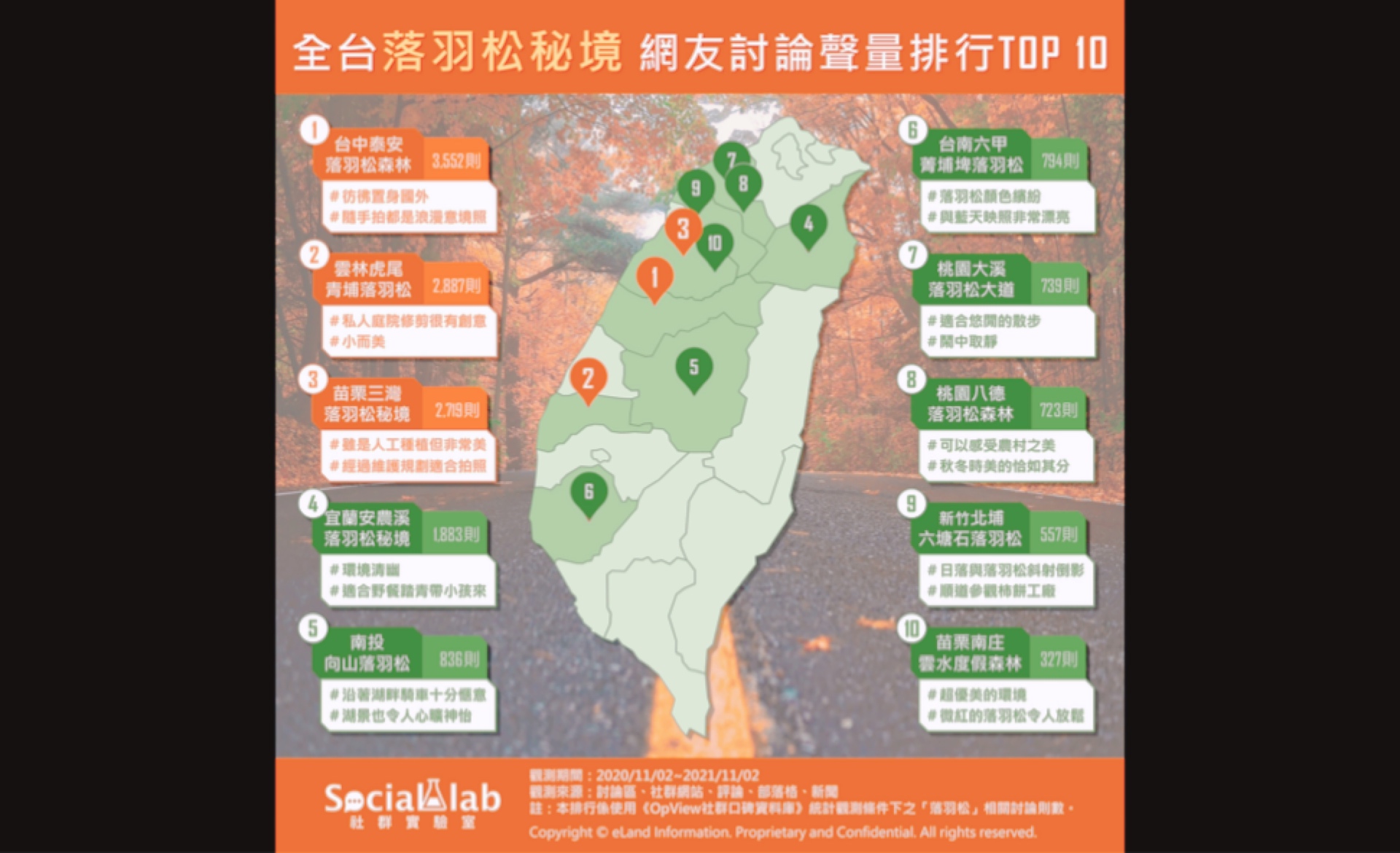 觀察近一年的「落羽松」相關討論聲量,可以看到網友對於台中「泰安落羽松」關注度最高,其中,最為人熟知的是羽粼落羽松,寬廣的松樹林倒映於湖面,成為秋冬時節最美麗的景色,而在步行約10分鐘距離處的泰安國小,也同樣因為落羽松的美景,成為民眾的討論焦點,網友紛紛留言讚嘆「覺得像置身國外」、「隨手一拍都是浪漫意境照」。