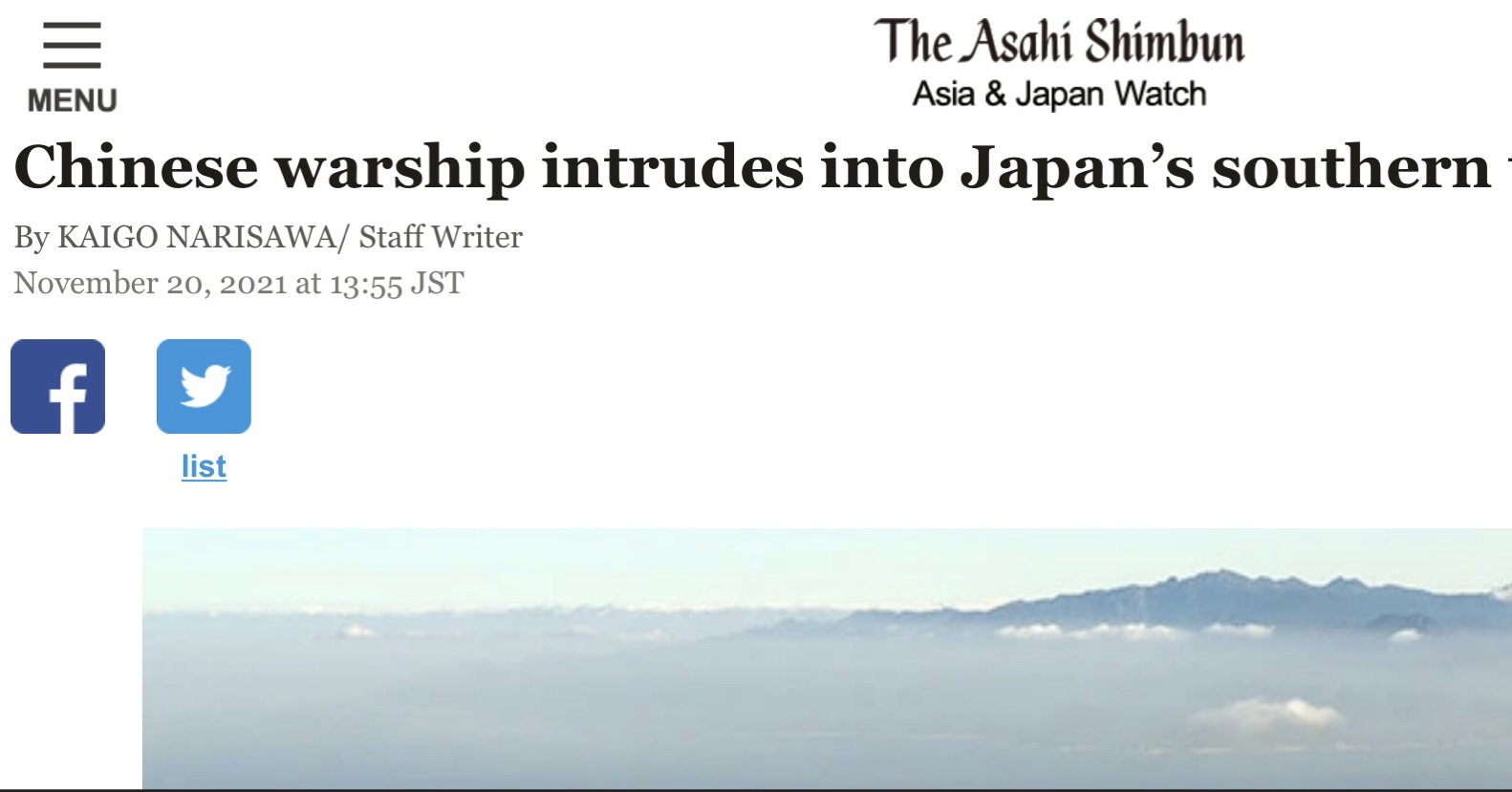 【愛傳媒張競評論】11月19日日本防衛省發佈中國大陸海軍艦艇在其周邊海域活動訊息新聞稿,日本媒體依此新聞稿加以報導,國內亦有多個媒體加以轉述報導。