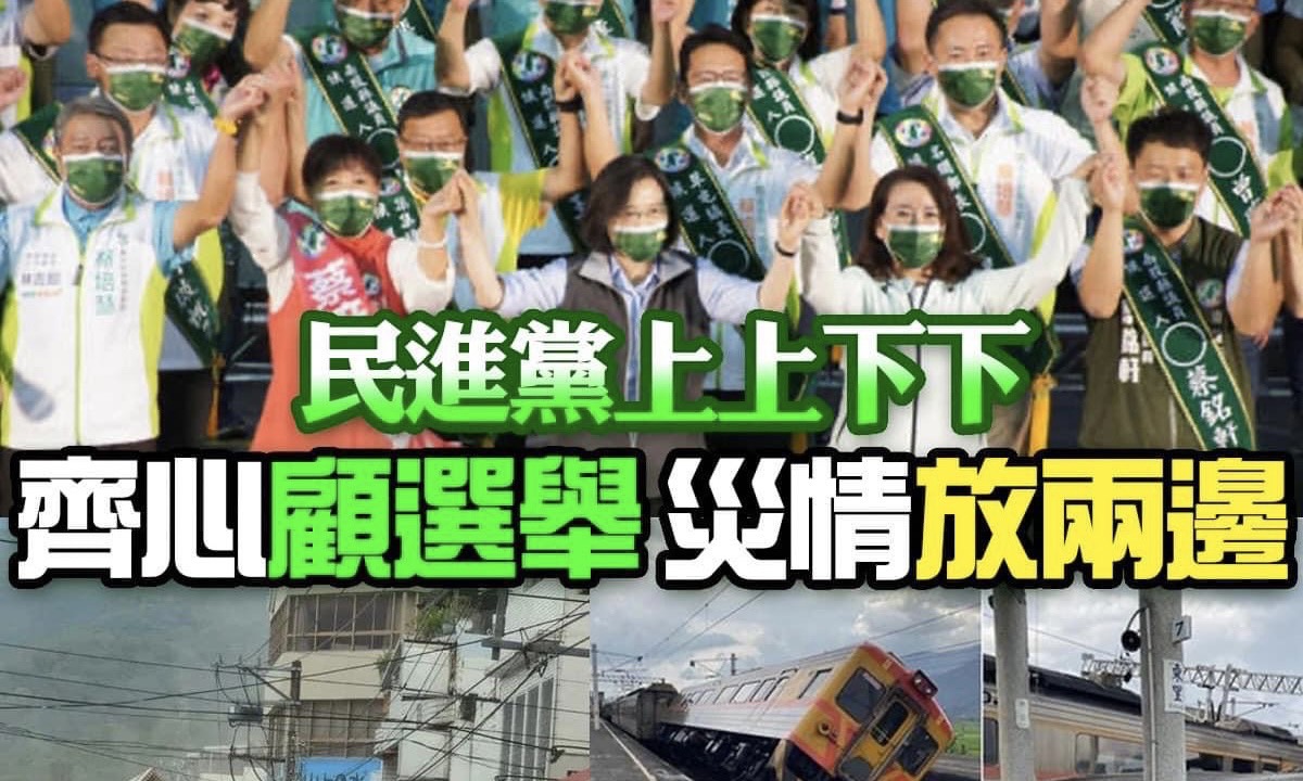 地震發生後,蔡英文仍堅持繼續完成蔡培慧的造勢活動;在橋樑斷裂、民宅倒塌、火車出軌、民眾傷亡受困等災情不斷傳出後,卻未見蔡英文關心災區的隻字片語,一個心中只有選舉,沒有國家、人民的總統,怎不考慮乾脆辭去總統,專心去做黨主席?
