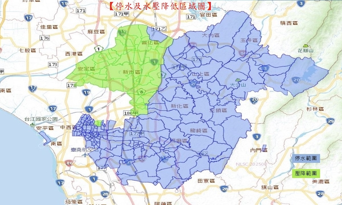 南市府觀光旅遊局指出,根據臺灣自來水公司預估本次工程影響供水的區域包含永康區、安平區、東區、中西區、北區、玉井區、南化區、安定區、新化區、左鎮區、善化區、大內區、山上區、新市區、歸仁區、關廟區、龍崎區、仁德區等18個行政區,影響範圍甚大,籲請旅宿業先行儲水準備,並提醒旅客於停水期間節約用水,其影響區域及時間說明如下: