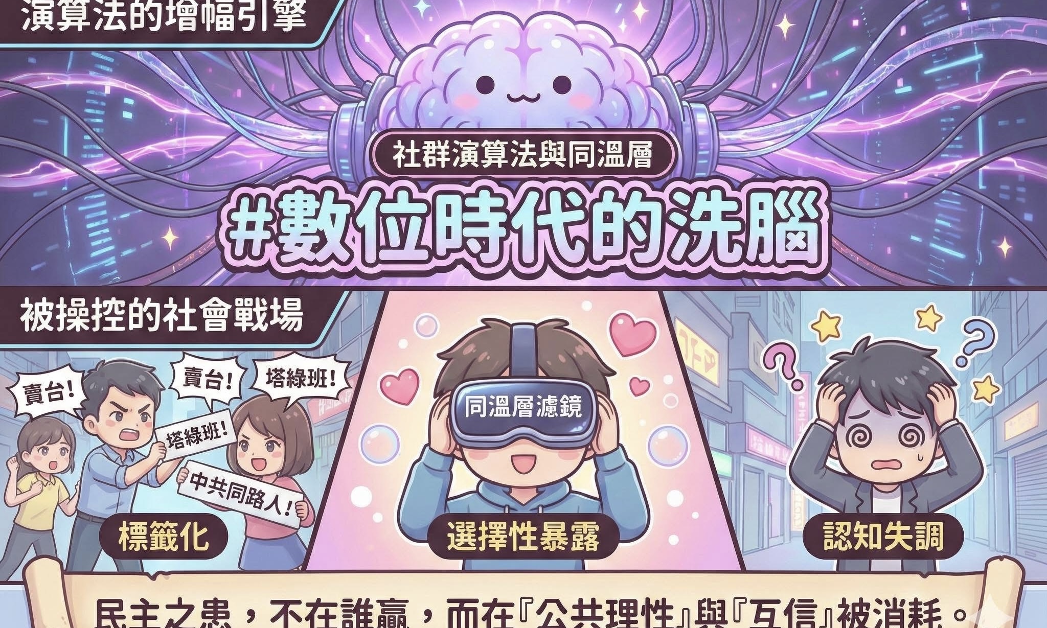 最令人憂慮的,是公共理性的流失。當每一方都深信自己「在守護民主」,卻無法容忍對方也可能出於制度信念行動,台灣的民主就陷入了「#多元外表下的思想單一」。這並非誰洗腦誰,而是整個社會被算法共同洗腦。我們的情緒、信任與判斷都被資料科學重新設計。