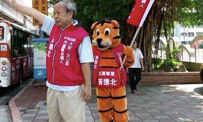 【記者賴御文報導】在學術界非常資深的工運教授黃德北,自從宣布投入台北市議員參選以來,拜票方式快速進步,現在的街頭拜票團隊還增加了一隻可愛的大型老虎人偶助陣,果然成功吸引許多司機與路人注意,尤其是小朋友們更是看了就開心。